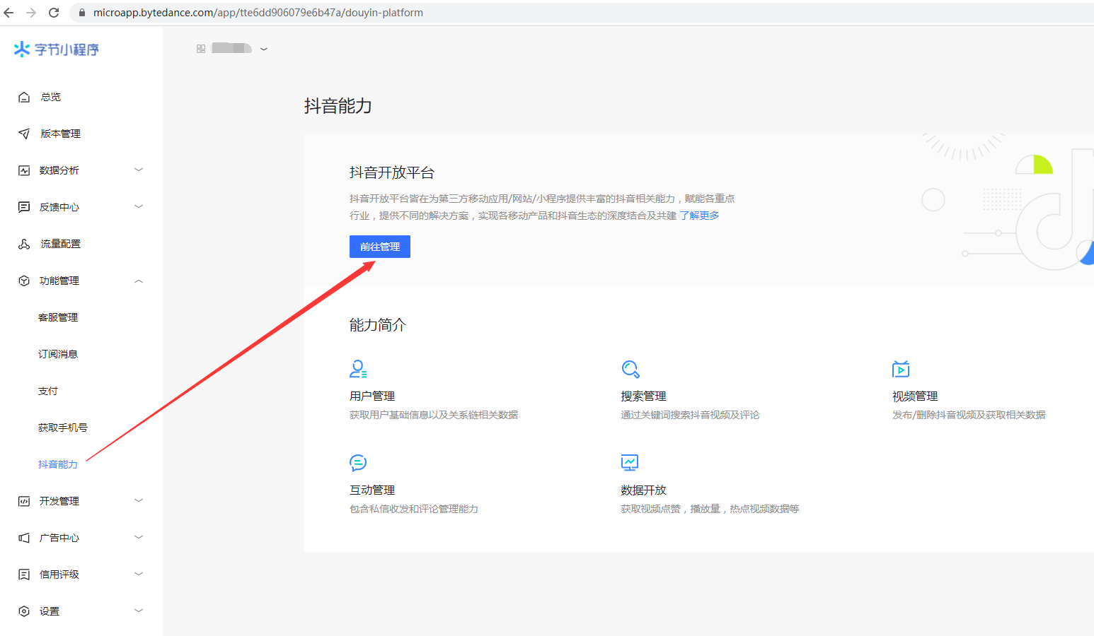 一、登录字节跳动小程序管理平台【功能管理】-【抖音能力】页面,点击【前往管理】按钮