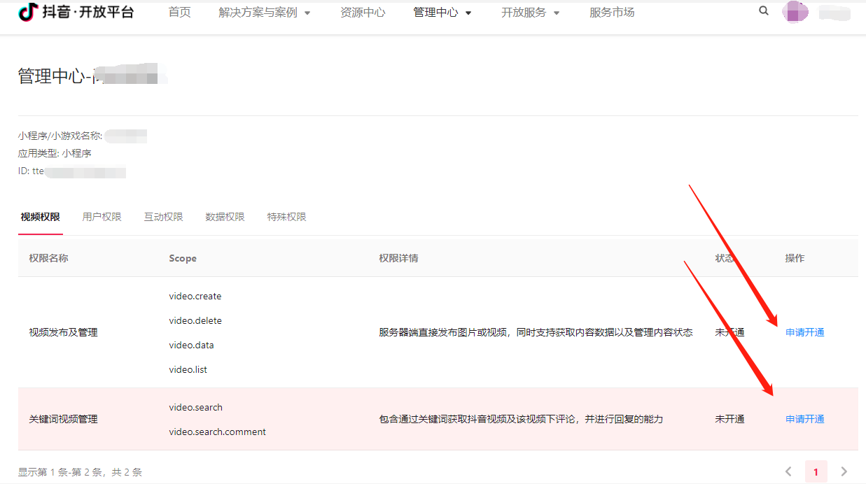 二、在新页面中【视频权限】选项卡页面,点击【视频发布及管理】后台的【申请开通】按钮。