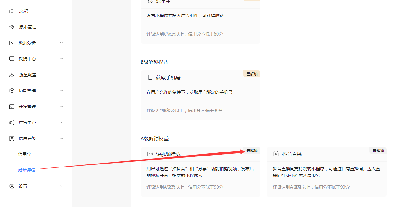 操作之前需要登录字节跳动小程序管理平台,查看质量评级是否达到A级,如果达到A级且信用分达90分以上,可进行如下申请及挂载操作。具体操作也可参考字节跳动官方文档:https://microapp.bytedance.com/docs/zh-CN/mini-app/introduction/flow-entrance/douyin/guazai/short-video-mount-applet/