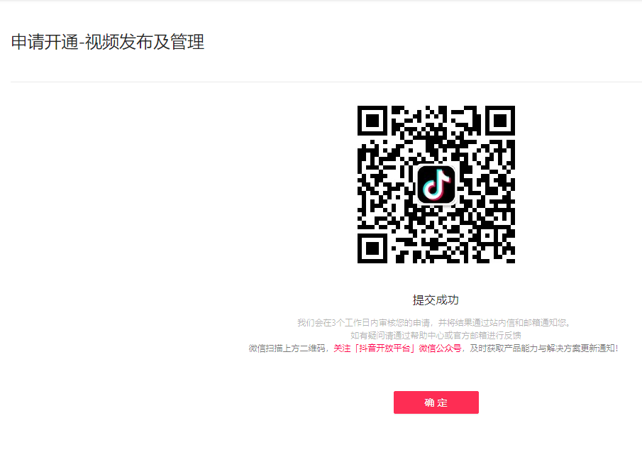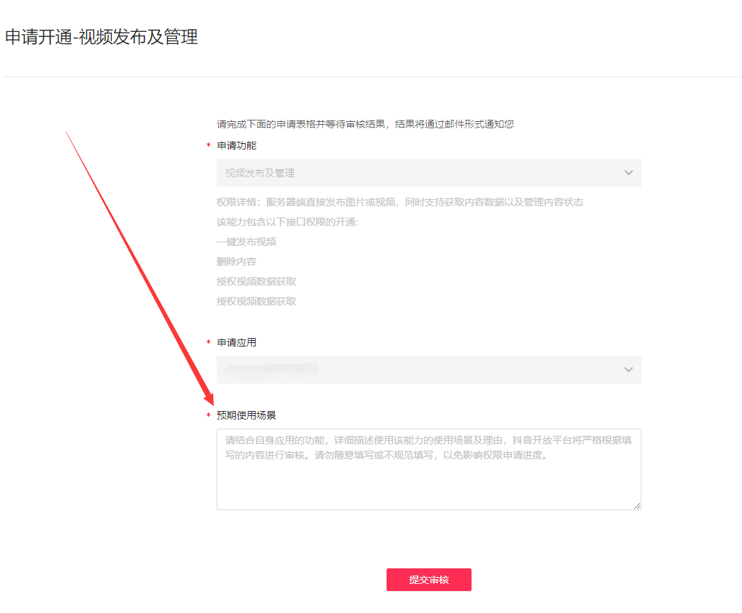 三、填写【预期使用场景】,提交审核,一般在3个工作日之内会有审核结果 。申请原因: 即小程序申请开通拍摄器能力的原因,例:当用户希望拍摄一些汽车相关的视频时,带上「懂车帝」小程序,给用户提供汽车相关更深度的内容跟信息。