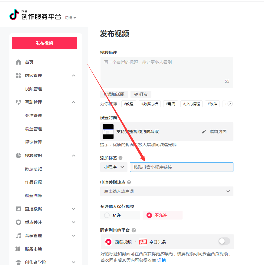 五、在PC端发布视频页面,将复制的小程序链接粘贴到对应的文本框中,然后填写其他信息操作发布视频。