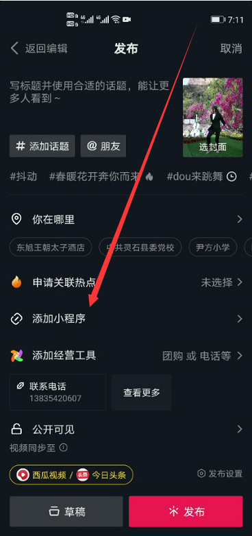 六、手机端操作挂载的话,在视频发布页面点击【添加小程序】