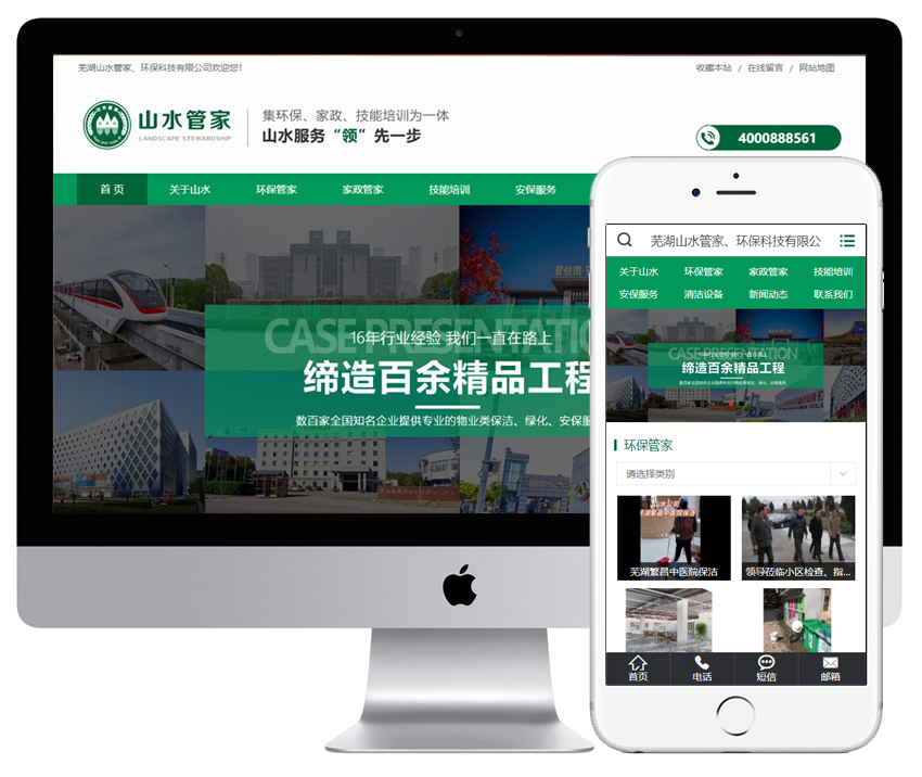 芜湖山水管家文化科技有限公司、芜湖山水环保科技有限公司是两家联合公司,正规注册、实力雄厚、专业从事于保洁的服务性公司。我公司拥有一批专业的管理人才和一支技术实力雄厚的员工队伍。主要从事大厦保洁、工厂保洁、开荒保洁、水电维修、家电清洗、治理甲醇、绿化养护、物业管理、疏通管道、高空作业、玻璃清洗、搬家清洗、涉及综合物业项目(环境分析测评、环境治理、城市道路和乡镇道路环卫清洁以及垃圾清运、绿化设计和实施养护、写字楼和住宅区的物业项目管理、房屋维修、安防工程的实施和维护等)。我们为各大企业,如:万科、芜湖碧桂园、无为碧桂园、南陵碧桂园、繁昌碧桂园、芜湖火车站、海螺、鑫隆国际、湾里军工企业、安展蔚然家园、居然之家、安师大、奇瑞等数百家全国知名企业提供专业的物业类保洁、绿化、安保服务。